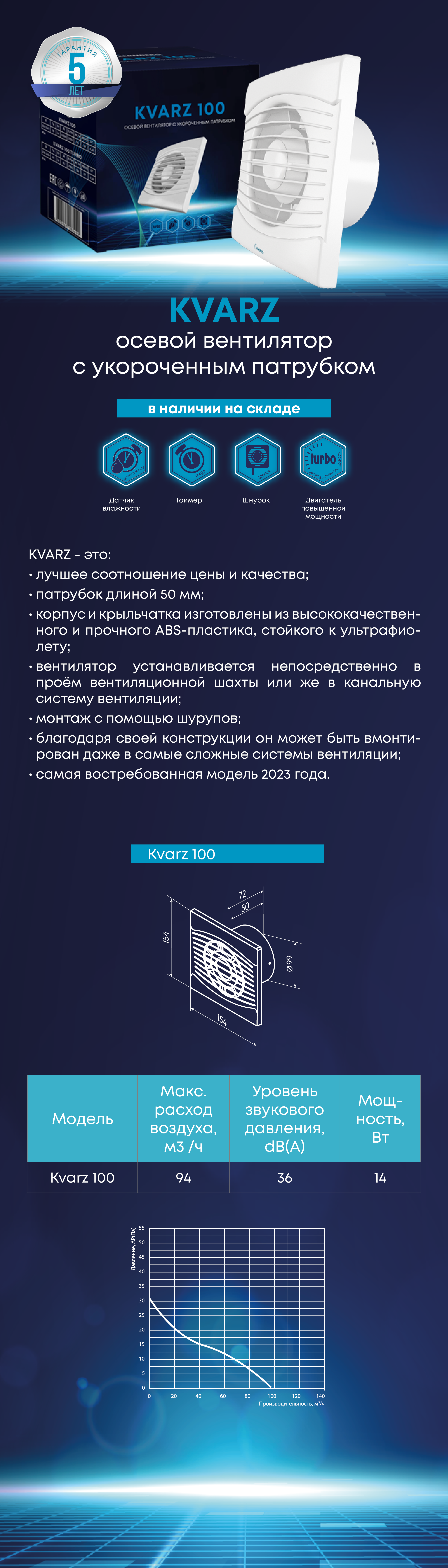 Вентилятор Kvarz 100 Н - датчик влажности. Если влажность в помещении превысит установленную на датчике значения 60-90%, то вентилятор автоматически включится и продолжит работу до тех пор, пока влажность не придет в норму; далее вентилятор отрабатывает время, установленное на таймере и выключается.
