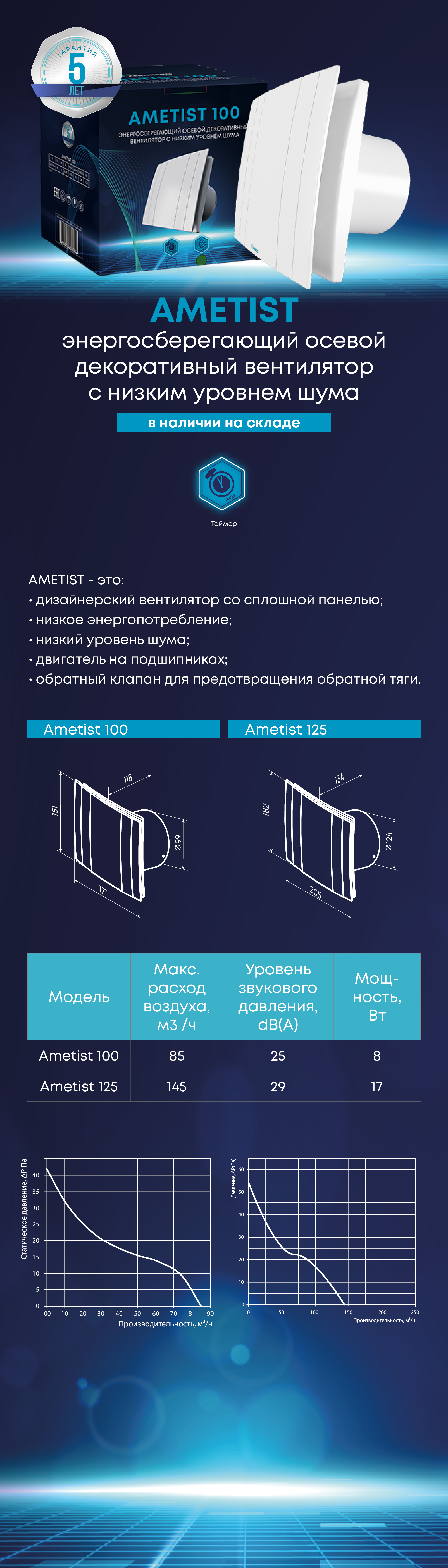 Вентилятор Ametist 100 T - встроенный регулируемый таймер задержки выключения позволяет вентилятору работать в течении от 2 до 30 мин. после остановки его выключателем.
