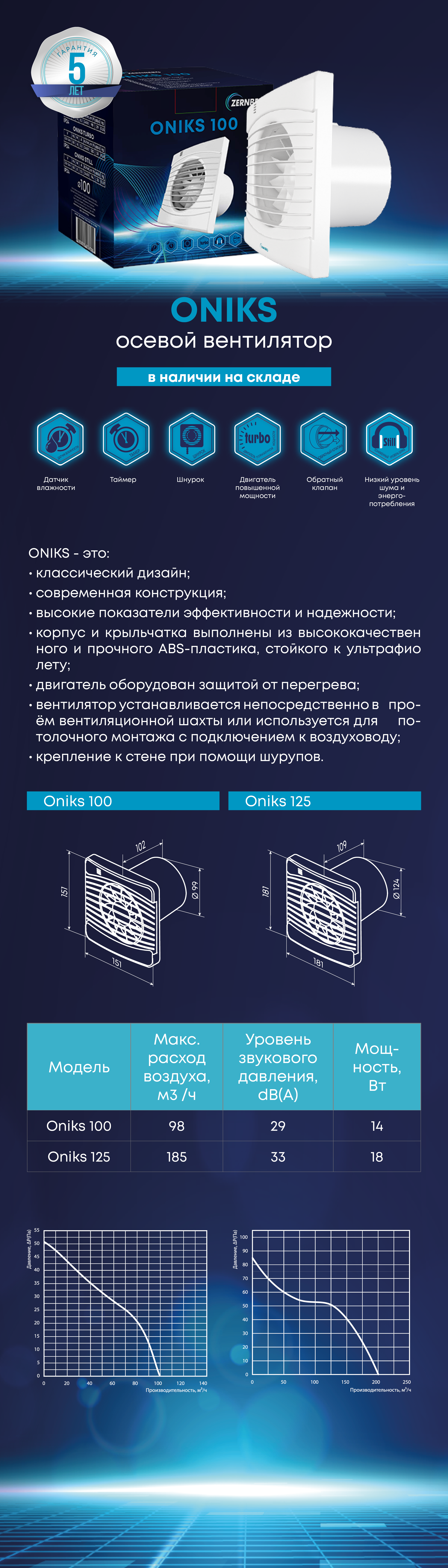 Вентилятор Oniks 125 Н - датчик влажности. Если влажность в помещении превысит установленную на датчике значения 60-90%, то вентилятор автоматически включится и продолжит работу до тех пор, пока влажность не придет в норму; далее вентилятор отрабатывает время, установленное на таймере и выключается.