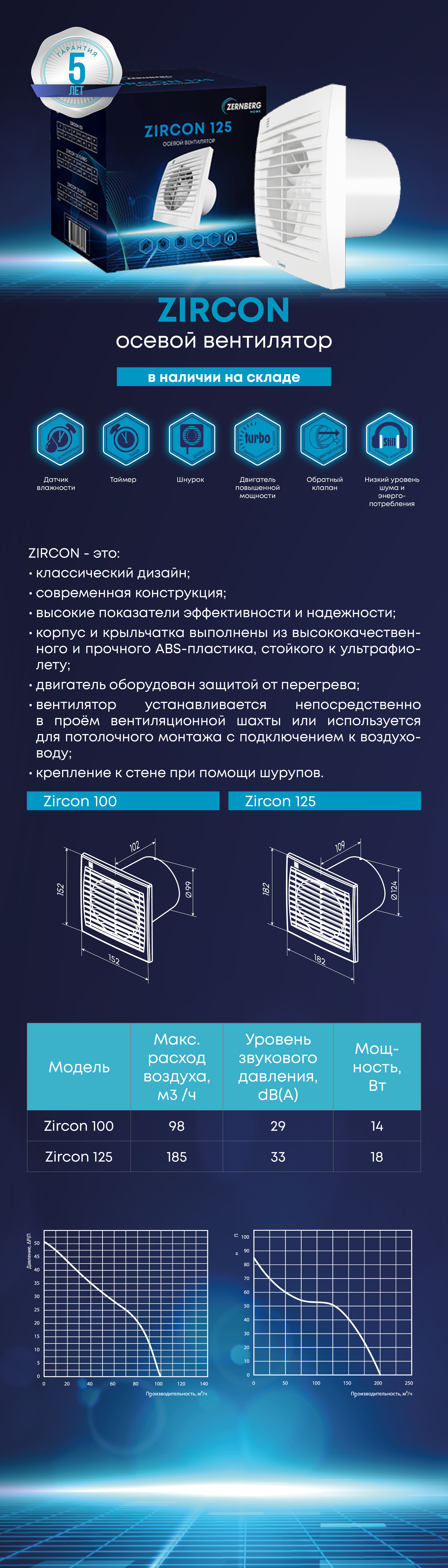 Вентилятор Zircon 125 Н - датчик влажности. Если влажность в помещении превысит установленную на датчике значения 60-90%, то вентилятор автоматически включится и продолжит работу до тех пор, пока влажность не придет в норму; далее вентилятор отрабатывает время, установленное на таймере и выключается.